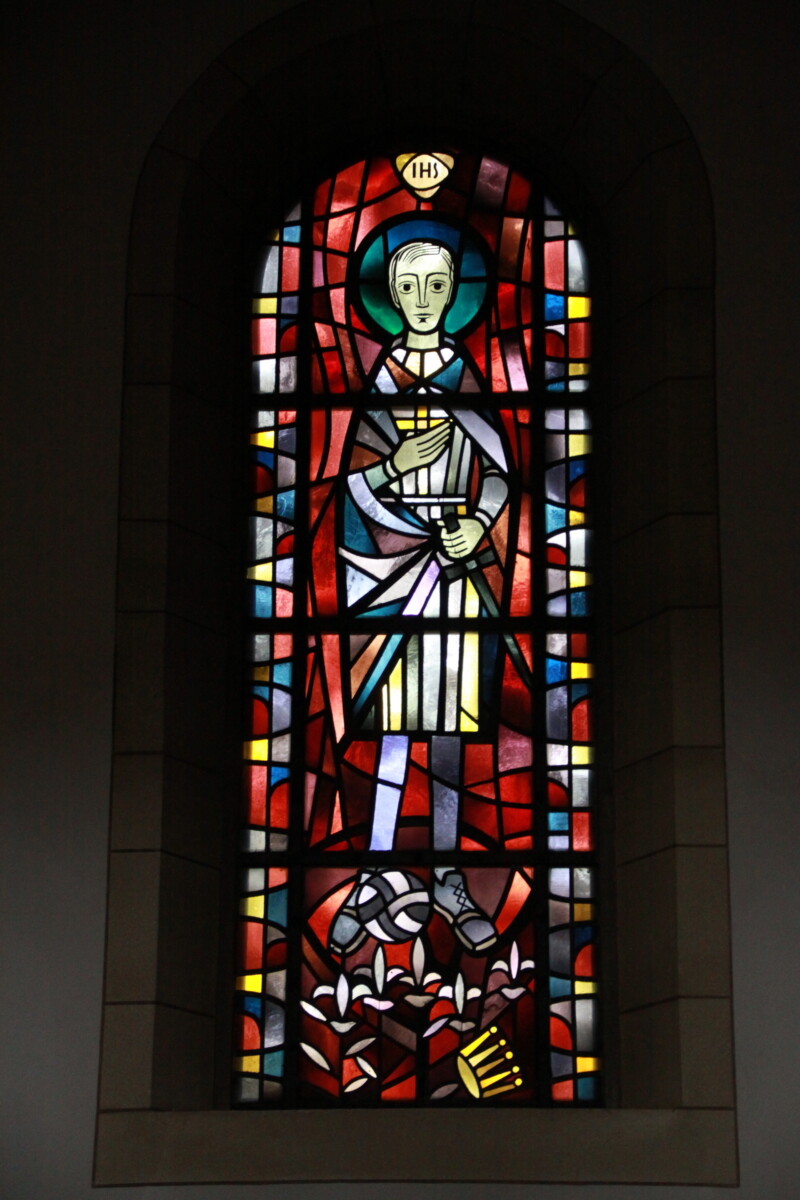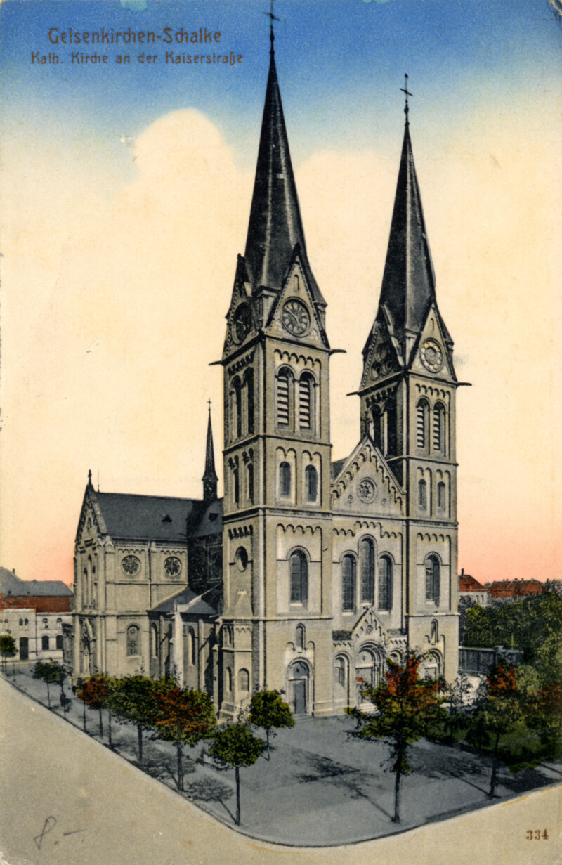 In der St.-Joseph-Kirche kamen sie alle zusammen. Hier saßen die Männer, die montags bis samstags unter der Erde oder am Hochofen malochten, neben den Spielern, die sie sonntags nachmittags in der Kampfbahn Glückauf anfeuerten. Abends feierten sie die Siege und Meisterschaften gemeinsam am Schalker Markt und in den Kneipen entlang der Schalker Meile. Dieses alte Schalke versank tragischerweise im Bombenhagel des Zweiten Weltkriegs. Nach ihrem Wiederaufbau erinnerte die St.-Joseph-Kirche mit ihren neuen Kirchenfenstern daran, was Schalke zu dem gemacht hat, was es ist: die Industrie, allen voran Zeche Consolidation, die Zuwanderer, die hier ein neues Zuhause fanden, und der Fußball. Mit dem Kirchenfenster des heiligen Aloisius unterstrich die Gemeinde ihre tiefe Verbindung zum FC Schalke 04: Das gegen Ende der 1950er-Jahre eingesetzte Fenster zeigt den Heiligen in blau-weißen Stutzen und mit einer Pille am Fuß.
