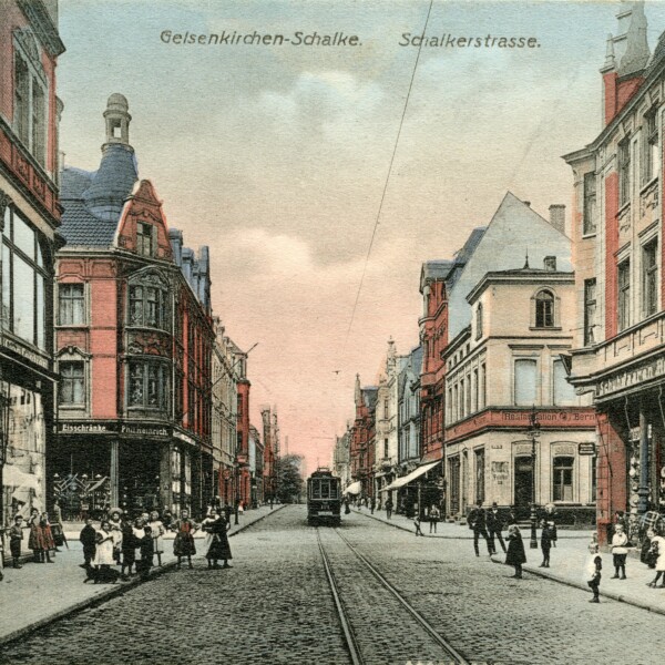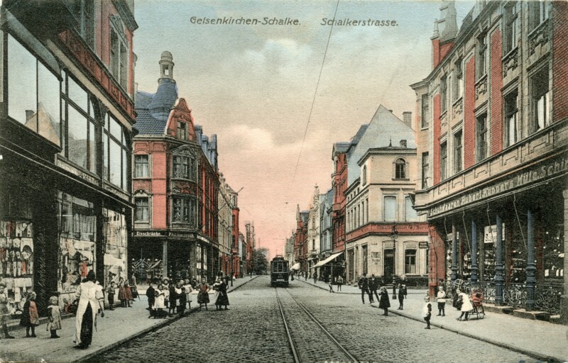 Der Feldweg, den Friedrich Grillo zwischen dem Dorf Gelsenkirchen und dem Schalker Markt anlegen ließ, entwickelte sich schnell zu einer Hauptverkehrsader. Seit 1895 fuhr die Straßenbahn durch die Schalker Straße. Gleichzeitig war sie die Einkaufsstraße in Schalke. In prächtigen Ladengeschäften fanden die Bewohner alle möglichen Waren. Auch das Schalker Gymnasium stand hier. In der Straße betrieben auch einige jüdische Inhaber ihre Geschäfte und lebten hier mit ihren Familien. Die meisten von ihnen unterstützten den FC Schalke 04 finanziell. Nachdem die Nationalsozialisten die Macht in Deutschland übernahmen, wurden sie enteignet und verfolgt. Leo Sauer wurde 1945 von den Nazis ermordet. Seine Geschichte zeigt, dass sich der FC Schalke 04 den Zeichen der Zeit nicht entziehen konnte oder wollte. Heute stellt sich der Verein seiner Vergangenheit und erinnert an der Veltins-Arena mit einer Gedenktafel an Leo Sauer.
