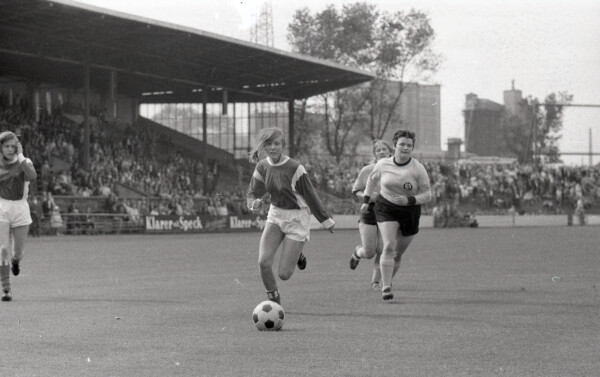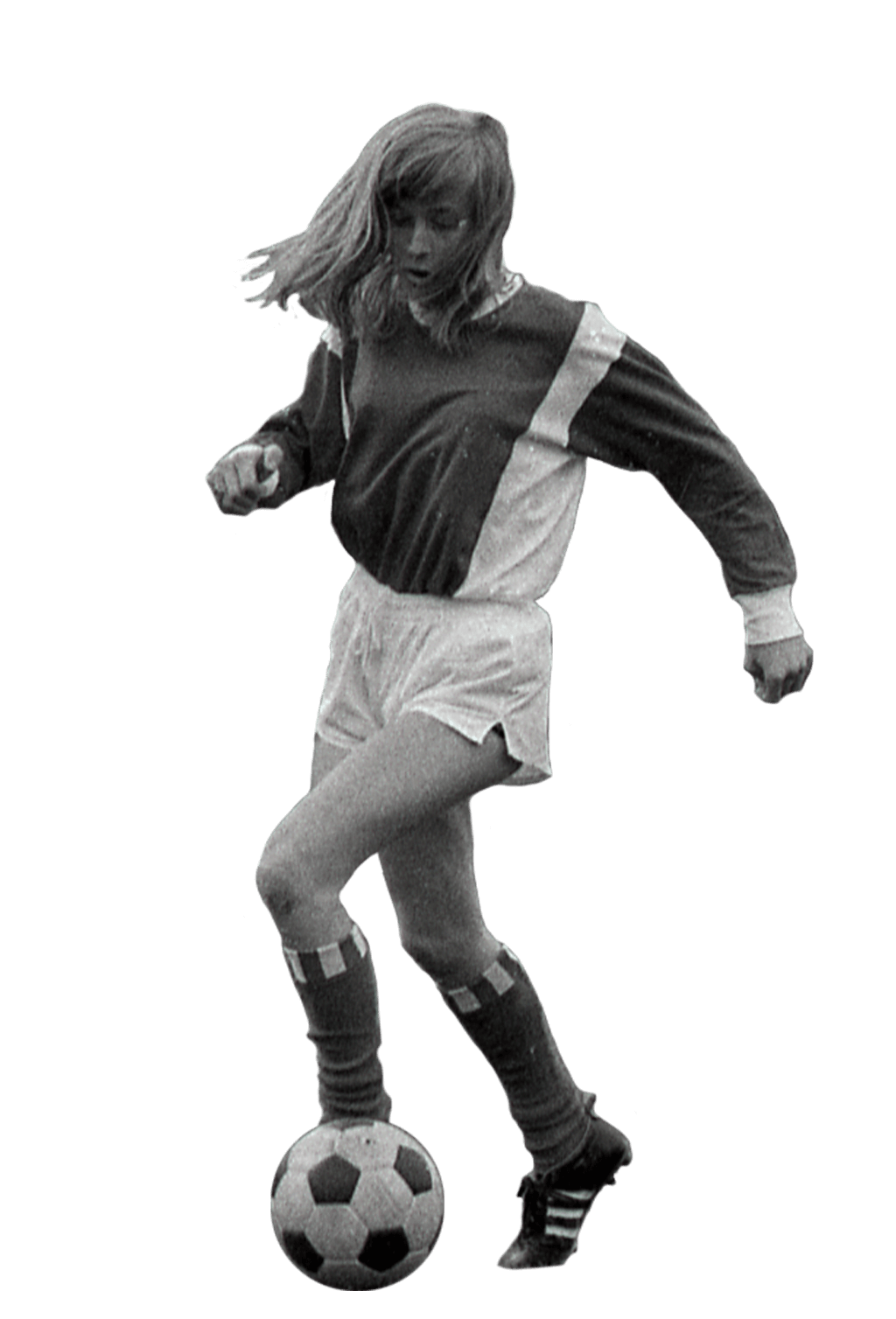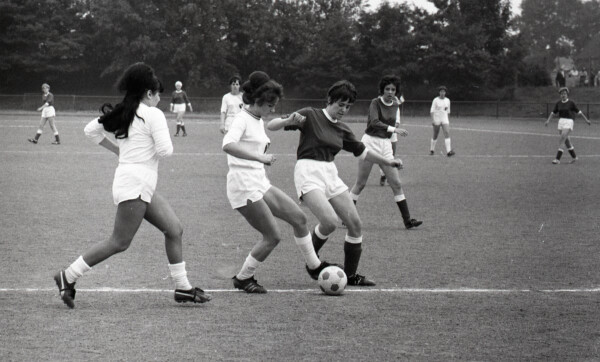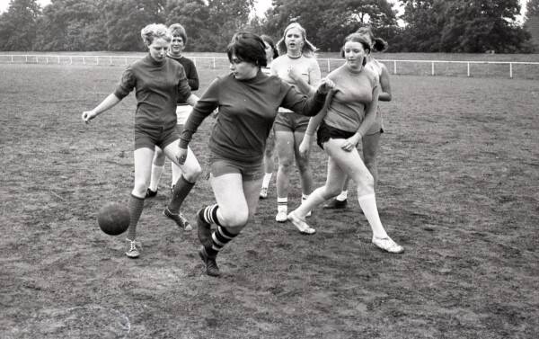 Auch auf anderem Feld kämpfen Frauen seit dem Zweiten Weltkrieg für Gleichberechtigung: auf dem Fußballfeld. Denn ein mächtiger Gegner stellt sich ihnen in den Weg. Der Deutsche Fußballbund (DFB) will kickende Frauen um jeden Preis verhindern. Zu groß sei der Schaden für die weibliche Anmut und die Sittlichkeit. 1955 wird ein Verbot erlassen: Frauenvereine werden nicht gestattet. Einige Frauen beeindruckt das aber nicht weiter. Sie gründen trotzdem ihre eigenen Vereine außerhalb des Verbands und organisieren ihre Spiele selbst. Es dauert einige Jahre, aber dann sieht der DFB ein: Er kann die Frauen nicht vom Spielen abhalten. 1970 hebt er das Verbot auf. Trotzdem setzt der DFB andere Regeln ein als bei den Männern. Die Damen dürfen nur zwei Halbzeiten von jeweils 30 Minuten spielen. Das Tragen von Stollenschuhen ist ihnen wegen der hohen Verletzungsgefahr verboten. Und ihr Ball ist ein wenig kleiner als die Bälle bei den Herren. Zum Teil hallen hier noch die Argumente gegen Frauenfußball aus den 1950er-Jahren nach.